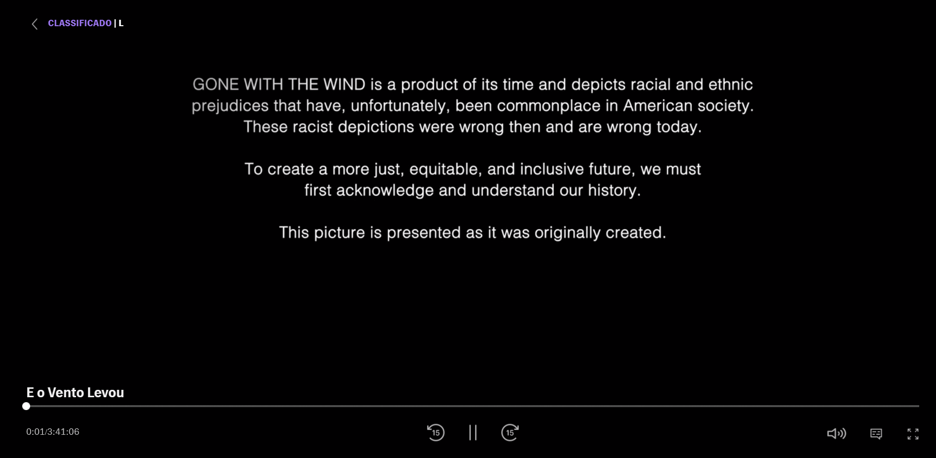 "'E o Vento Levou' é um produto de seu tempo e retrata alguns dos preconceitos étnicos e raciais que, infelizmente, são comuns na sociedade americana. Essas representações racistas estavam erradas na época e estão erradas hoje", diz o alerta assim que a produção começa. "Para criar um futuro mais justo, igualitário e inclusivo, devemos primeiro reconhecer e compreender nossa história. Esta produção é apresentada como foi originalmente criada".